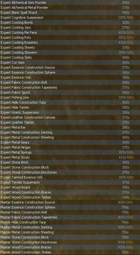 Armorcraft - Artani ![]() Metalworking / Scultping / Woodworking - Pita ![]() Fletching - Nadja ![]() Jewelcraft - Vesh ![]() Processing Formulas - Florica ![]() Scalecraft - Palko ![]() |