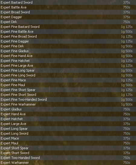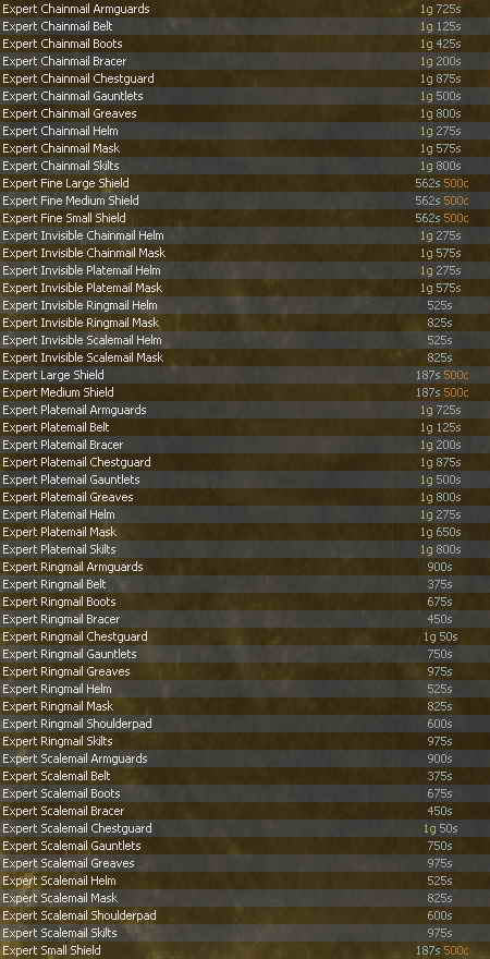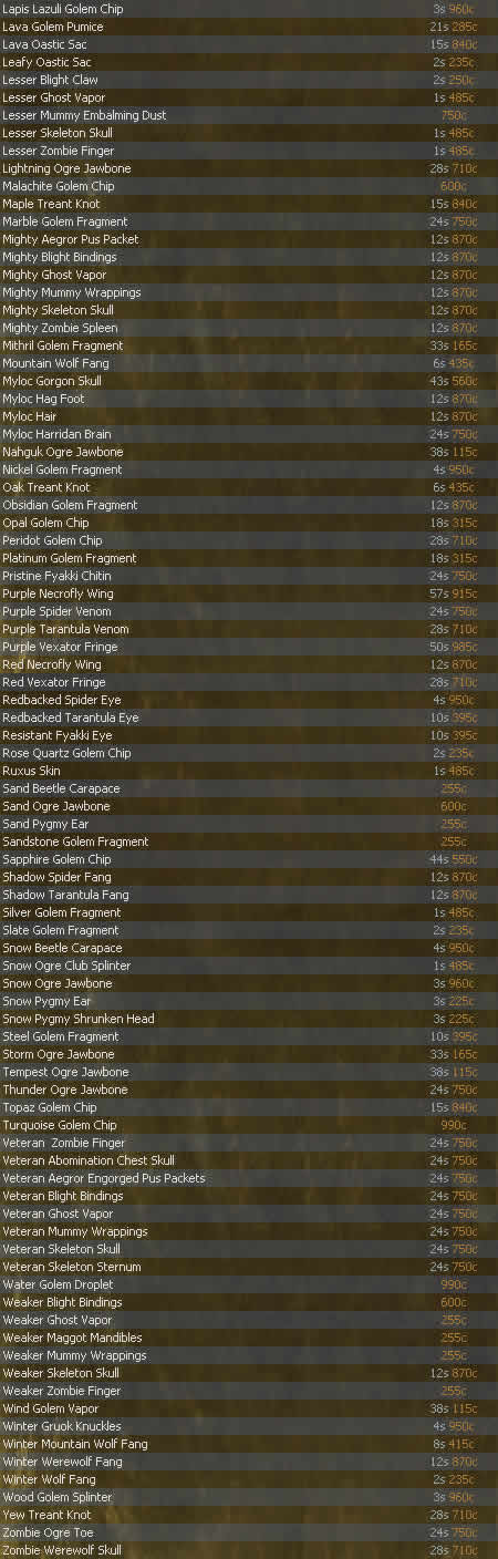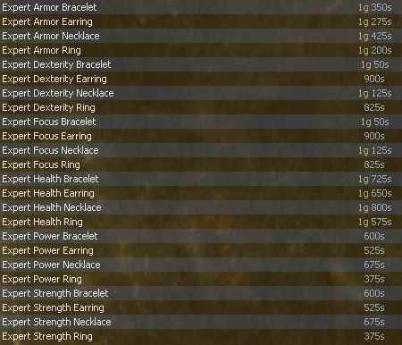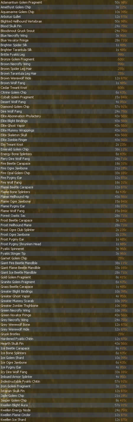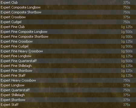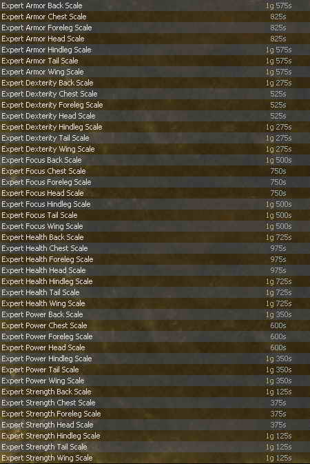 Armorcraft - Artani ![]() Metalworking / Scultping / Woodworking - Pita ![]() Fletching - Nadja ![]() Jewelcraft - Vesh ![]() Processing Formulas - Florica ![]() Scalecraft - Palko ![]() |
