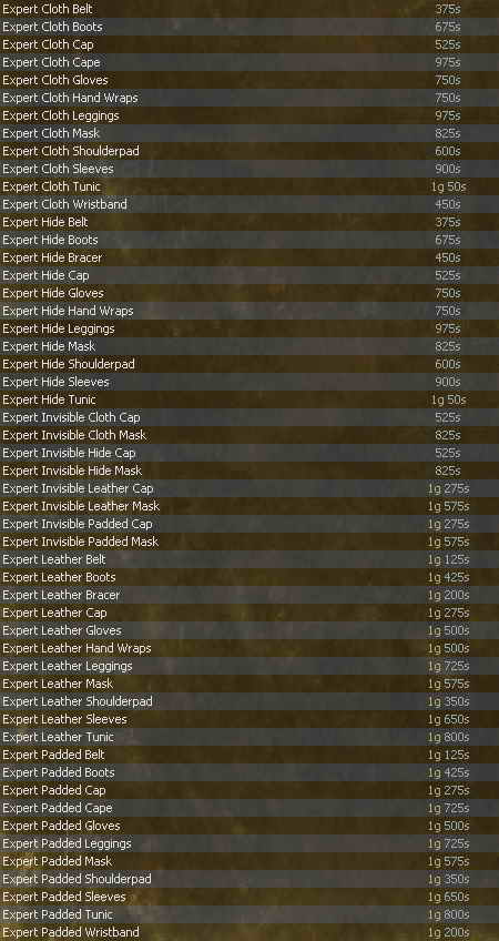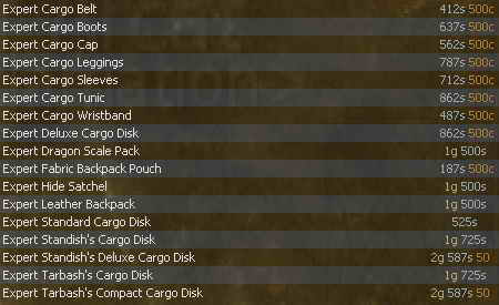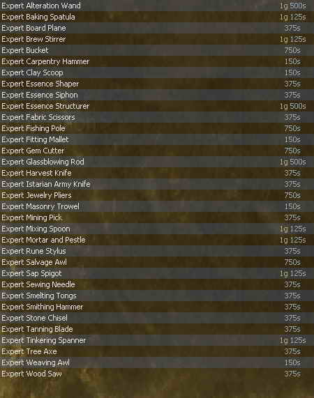 Spellcraft - Granja ![]() Tailoring / Clothworking - Dilaver ![]() Tinkering - Karlottia ![]() Weaponcraft - Boltoro ![]() |